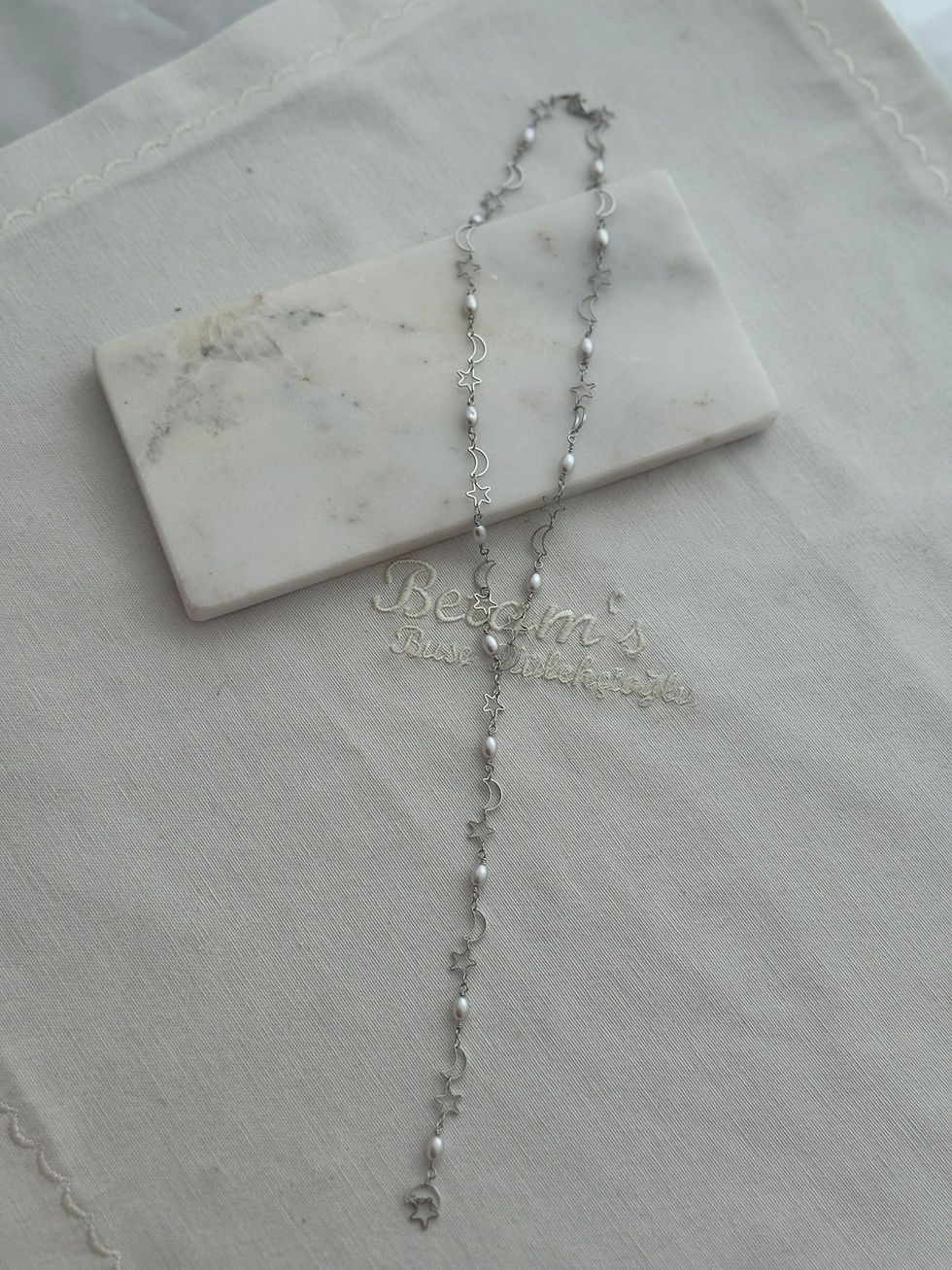 Gümüş incili yıldız ve ay detaylı y çelik kolye DC-088